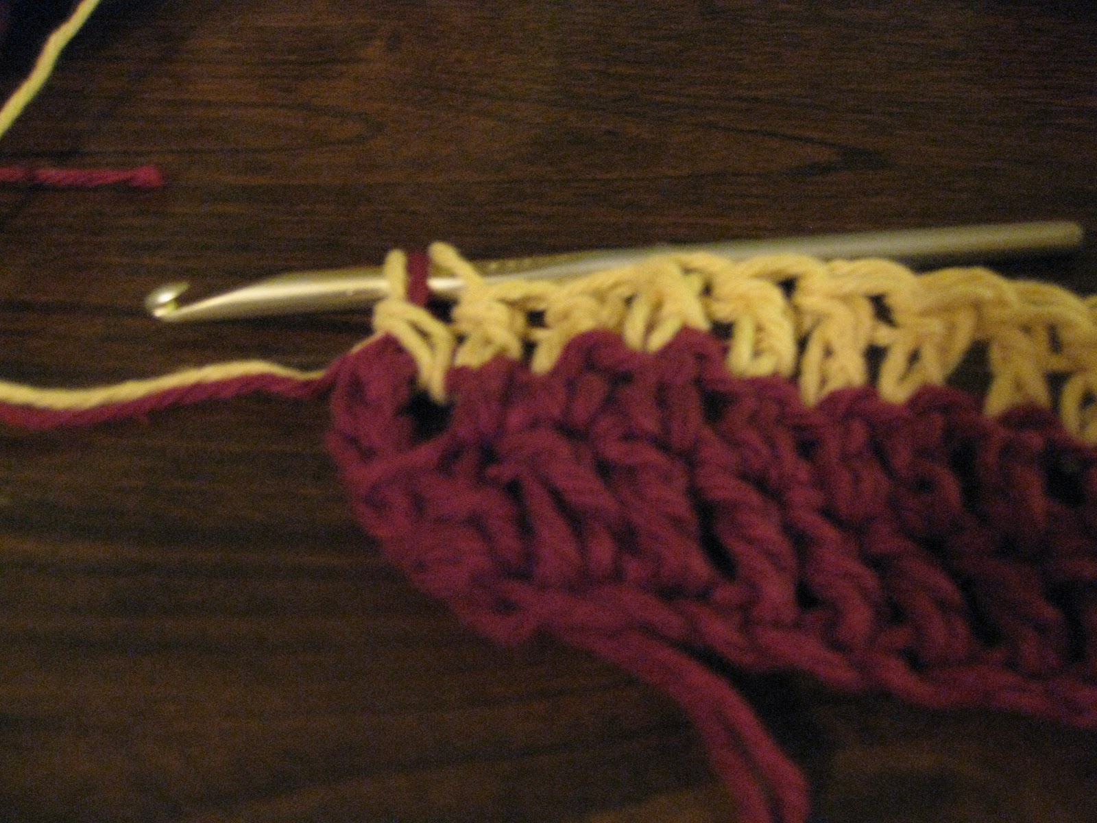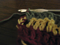 Make your chain and work one row with color B. At the end of the row, tie on color C, do not cut color B. Finish the stitch by pulling both strands together through the loops. Chain with both strands.